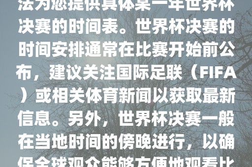 摘要:本文指出无法提供具体某一年世界杯决赛的时间表,建议读者关注国际足联或相关体育新闻以获取最新信息。世界杯决赛通常在当地时间的傍晚进行,以确保全球观众能够方便地观看比赛。具体决赛时间安排在比赛开始前公布。