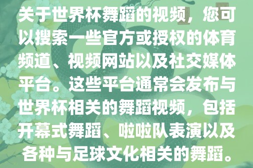 关于世界杯舞蹈的视频,您可以搜索一些官方或授权的体育频道、视频网站以及社交媒体平台。这些平台通常会发布与世界杯相关的舞蹈视频,包括开幕式舞蹈、啦啦队表演以及各种与足球文化相关的舞蹈。
