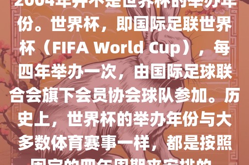 2004年并不是世界杯的举办年份。世界杯,即国际足联世界杯(FIFA World Cup),每四年举办一次,由国际足球联合会旗下会员协会球队参加。历史上,世界杯的举办年份与大多数体育赛事一样,都是按照固定的四年周期来安排的。