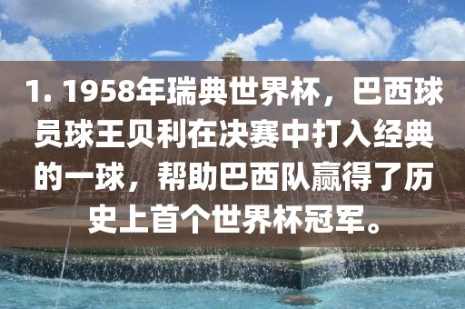 1. 1958年瑞典世界杯,巴西球员球王贝利在决赛中打入经典的一球,帮助巴西队赢得了历史上首个世界杯冠军。