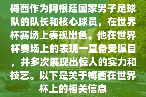 梅西作为阿根廷国家男子足球队的队长和核心球员,在世界杯赛场上表现出色。他在世界杯赛场上的表现一直备受瞩目,并多次展现出惊人的实力和技艺。以下是关于梅西在世界杯上的相关信息
