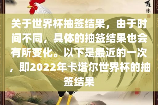 关于世界杯抽签结果,由于时间不同,具体的抽签结果也会有所变化。以下是最近的一次,即2022年卡塔尔世界杯的抽签结果