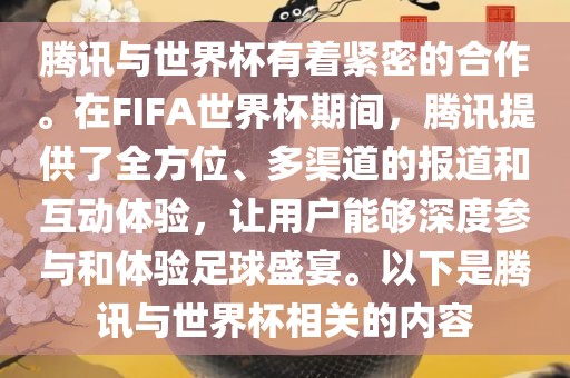 腾讯与世界杯有着紧密的合作。在FIFA世界杯期间,腾讯提供了全方位、多渠道的报道和互动体验,让用户能够深度参与和体验足球盛宴。以下是腾讯与世界杯相关的内容