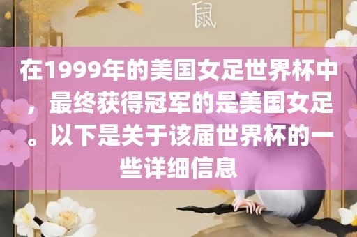 在1999年的美国女足世界杯中,最终获得冠军的是美国女足。以下是关于该届世界杯的一些详细信息