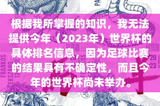 摘要:由于足球比赛的不可预测性和不确定性,无法提供关于今年(2023年)世界杯的具体排名信息。今年的世界杯尚未举办,因此无法确定各队的实力和表现。请继续关注相关赛事,以获取最新的比赛结果和排名信息。