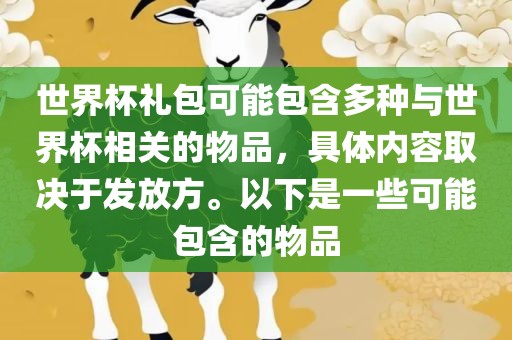 世界杯礼包可能包含多种与足球盛事相关的物品,具体内容因发放方而异。可能包含的物品包括世界杯吉祥物、纪念币、官方授权的商品、足球、球衣、比赛门票等。这些物品都具有收藏价值和纪念意义,让球迷们更好地感受世界杯的氛围和精彩瞬间。摘要字数控制在100-200字以内。