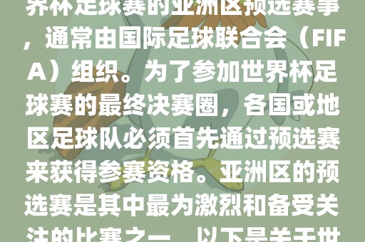 世界杯亚洲区预选赛是各国足球队争夺世界杯参赛资格的重要赛事之一,也是展示亚洲足球实力和风格的重要舞台,对于足球爱好者和球迷来说,关注世界杯亚洲区预选赛可以欣赏到高水平的足球比赛和精彩的竞技瞬间,如需了解更多信息,可以关注FIFA官网或相关体育新闻资讯。