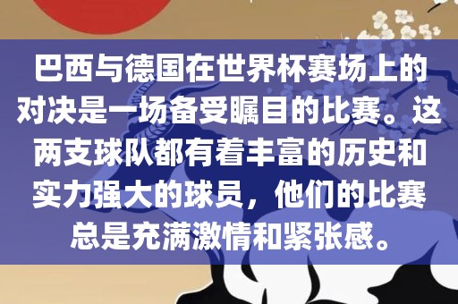 巴西与德国在世界杯赛场上的对决是一场备受瞩目的比赛,双方球队历史悠久,实力强大,球员技艺高超。这场对决充满激情与紧张感,吸引了全球球迷的关注。