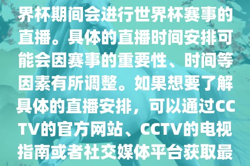 CCTV将在世界杯期间直播世界杯赛事,直播时间安排可能因赛事重要性和时间等因素有所调整。观众可通过CCTV官方网站、电视指南或社交媒体平台获取最新的直播安排信息。摘要字数控制在100-200字以内。