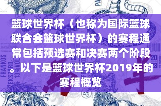 篮球世界杯(也称为国际篮球联合会篮球世界杯)的赛程通常包括预选赛和决赛两个阶段。以下是篮球世界杯2019年的赛程概览