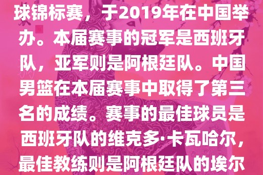 摘要:2019年国际篮联篮球世界杯在中国举办,西班牙队夺得冠军,中国男篮取得第三名。最佳球员为西班牙队的维克多·卡瓦哈尔,最佳教练为阿根廷队的埃尔南多·贝拉斯科。本届赛事创造了多项纪录,包括观众人数超过全球电视观众人数等。