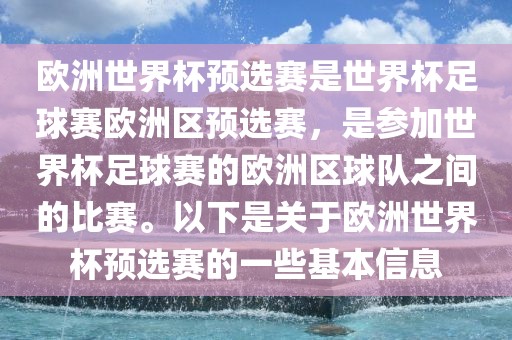 欧洲世界杯预选赛是世界杯足球赛欧洲区预选赛,是参加世界杯足球赛的欧洲区球队之间的比赛。以下是关于欧洲世界杯预选赛的一些基本信息
