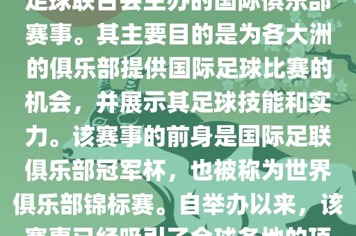 国际足联俱乐部世界杯是一项由国际足球联合会主办的国际俱乐部赛事,旨在为全球各大洲的俱乐部提供国际比赛机会并展示其实力。该赛事前身是世界俱乐部锦标赛,自举办以来吸引了全球顶级俱乐部参与。获得该赛事冠军是全球俱乐部足球的最高荣誉之一。