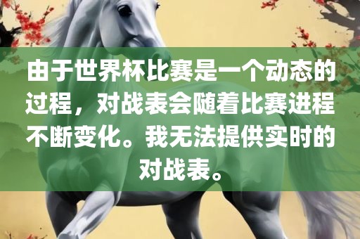 由于世界杯比赛是一个动态的过程,对战表会随着比赛进程不断变化。我无法提供实时的对战表。