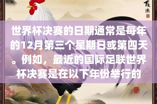 世界杯决赛的日期通常是每年的12月第三个星期日或第四天。例如,最近的国际足联世界杯决赛是在以下年份举行的