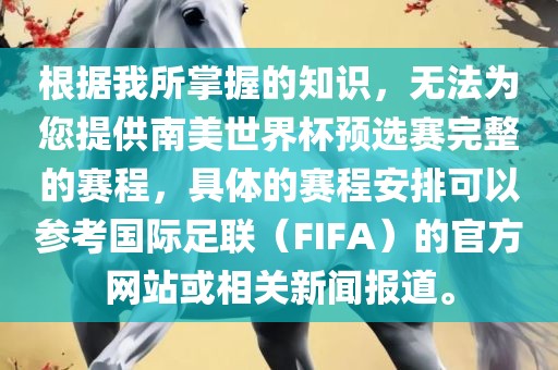 摘要:本文简要提及无法提供南美世界杯预选赛完整赛程的情况,建议读者可以参考国际足联的官方网站或关注相关新闻报道以获取具体的赛程安排。