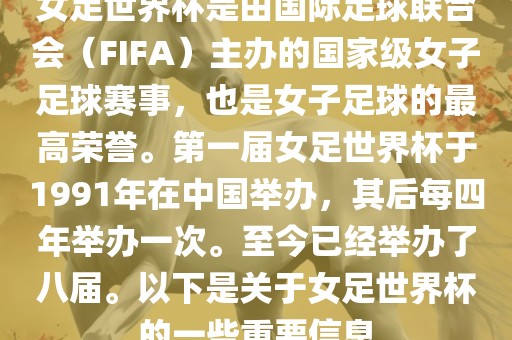 女足世界杯是由国际足球联合会(FIFA)主办的国家级女子足球赛事,也是女子足球的最高荣誉。第一届女足世界杯于1991年在中国举办,其后每四年举办一次。至今已经举办了八届。以下是关于女足世界杯的一些重要信息