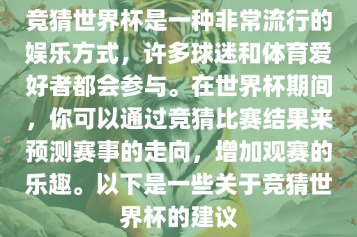 竞猜世界杯是一种非常流行的娱乐方式,许多球迷和体育爱好者都会参与。在世界杯期间,你可以通过竞猜比赛结果来预测赛事的走向,增加观赛的乐趣。以下是一些关于竞猜世界杯的建议