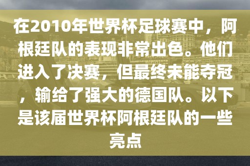 在2010年世界杯足球赛中,阿根廷队表现出色,进入决赛但未能夺冠。他们在比赛中有许多亮点,包括出色的球员表现、战术安排和比赛精神。尽管最终输给了德国队,但他们的表现令人印象深刻,成为该届世界杯足球赛中的一支重要眉山市正发家政服务有限公司力量。...