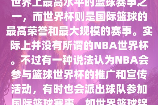 NBA(美国职业篮球联赛)是世界上最高水平的篮球赛事之一,而世界杯则是国际篮球的最高荣誉和最大规模的赛事。实际上并没有所谓的NBA世界杯。不过有一种说法认为NBA会参与篮球世界杯的推广和宣传活动,有时也会派出球队参加国际篮球赛事,如世界篮球锦标赛等。