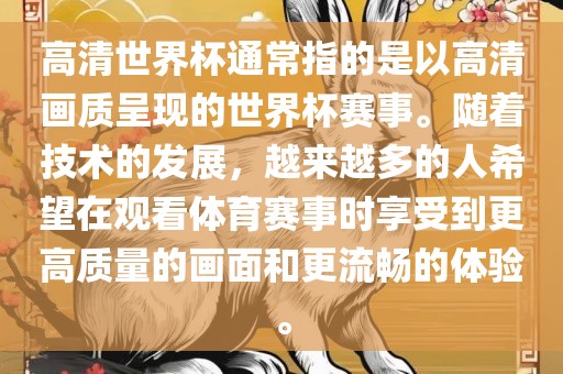 高清世界杯通常指的是以高清画质呈现的世界杯赛事。随着技术的发展,越来越多的人希望在观看体育赛事时享受到更高质量的画面和更流畅的体验。