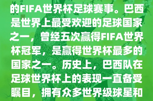 转载请注明来自眉山市正发家政服务有限公司,本文标题:《巴西足球世界杯是指巴西举办的FIFA世界杯足球赛事。巴西是世界上最受欢迎的足球国家之一,曾经五次赢得FIFA世界杯冠军,是赢得世界杯最多的国家之一。历史上,巴西队在足球世界杯上的表现一直备受瞩目,拥有众多世界级球星和精彩比赛瞬间?!?/a>