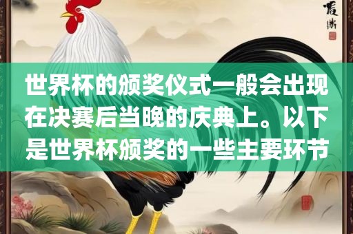 世界杯的颁奖仪式一般会出现在决赛后当晚的庆典上。以下是世界杯颁奖的一些主要环节