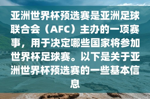 亚洲世界杯预选赛是亚洲足球联合会(AFC)主办的一项赛事,用于决定哪些国家将参加世界杯足球赛。以下是关于亚洲世界杯预选赛的一些基本信息
