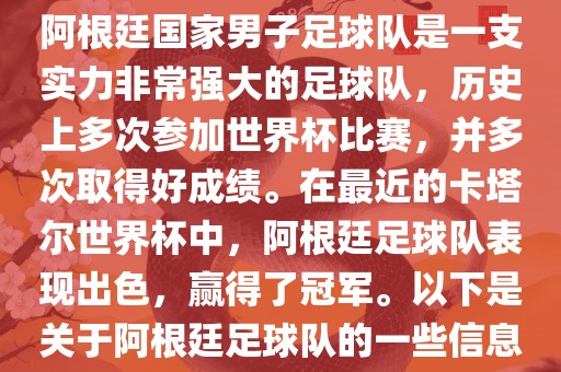 阿根廷足球队在世界杯历史上有着辉煌的战绩,曾参加过多次世界杯比赛,并多次进入决赛,阿根廷足球队在世界杯历史上拥有多个经典比赛和精彩瞬间,如马拉多纳的神奇表现等,在卡塔尔世界杯中,阿根廷足球队的表现备受瞩目,球队在比赛中展现出了强大的实力和精湛的技艺,最终成功夺冠,球队的核心球员梅西在比赛中表现出色,成为球队的关键人物之一,阿根廷足球队在卡塔尔世界杯中还展现出了年轻球员的潜力和实力,为未来的比赛打下了坚实的基础。