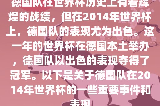 德国队在世界杯历史上有着辉煌的战绩,但在2014年世界杯上,德国队的表现尤为出色。这一年的世界杯在德国本土举办,德国队以出色的表现夺得了冠军。以下是关于德国队在2014年世界杯的一些重要事件和表现