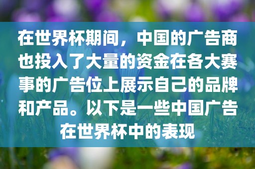 在世界杯期间,中国的广告商也投入了大量的资金在各大赛事的广告位上展示自己的品牌和产品。以下是一些中国广告在世界杯中的表现