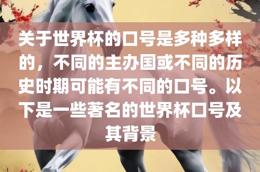 除此之外,每一届世界杯也都有自己的独特口号,旨在表达主办国对足球的热情和对世界杯的期待,这些口号不仅代表了世界杯的精神和文化内涵,也成为了世界杯历史的重要组成部分,如果您对某一届世界杯的口号有更具体的问题,欢迎继续向我提问。