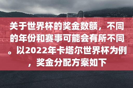 关于世界杯的奖金数额,不同的年份和赛事可能会有所不同。以2022年卡塔尔世界杯为例,奖金分配方案如下