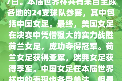 摘要:2019年女足世界杯在法国举行,是首次在欧洲举办的世界杯。比赛时间为一个月,共有来自全球各地的24支球队参赛,包括中国女足。美国女足夺冠,荷兰和瑞典分别获得亚军和季军。中国女足表现备受关注但未进八强。本届世界杯还创造了多项纪录和亮点。