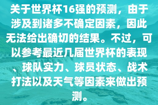 关于世界杯16强的预测,由于涉及到诸多不确定因素,因此无法给出确切的结果。不过,可以参考最近几届世界杯的表现、球队实力、球员状态、战术打法以及天气等因素来做出预测。