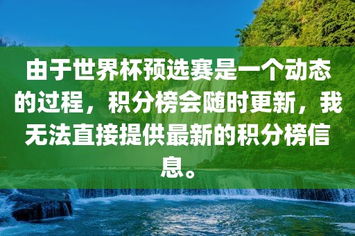 由于世界杯预选赛是一个动态的过程,积分榜会随时更新,我无法直接提供最新的积分榜信息。