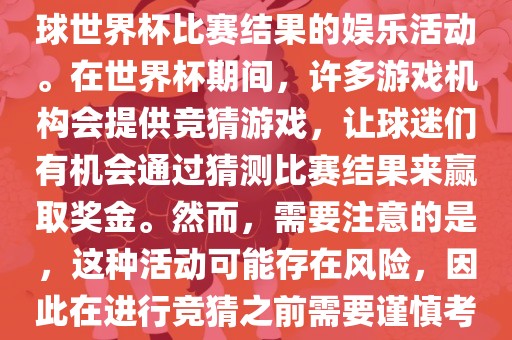 世界杯竞猜游戏是一种有趣的娱乐方式,但需要谨慎参与,遵守法律法规和游戏机构的规定,保持理性和冷静的态度。